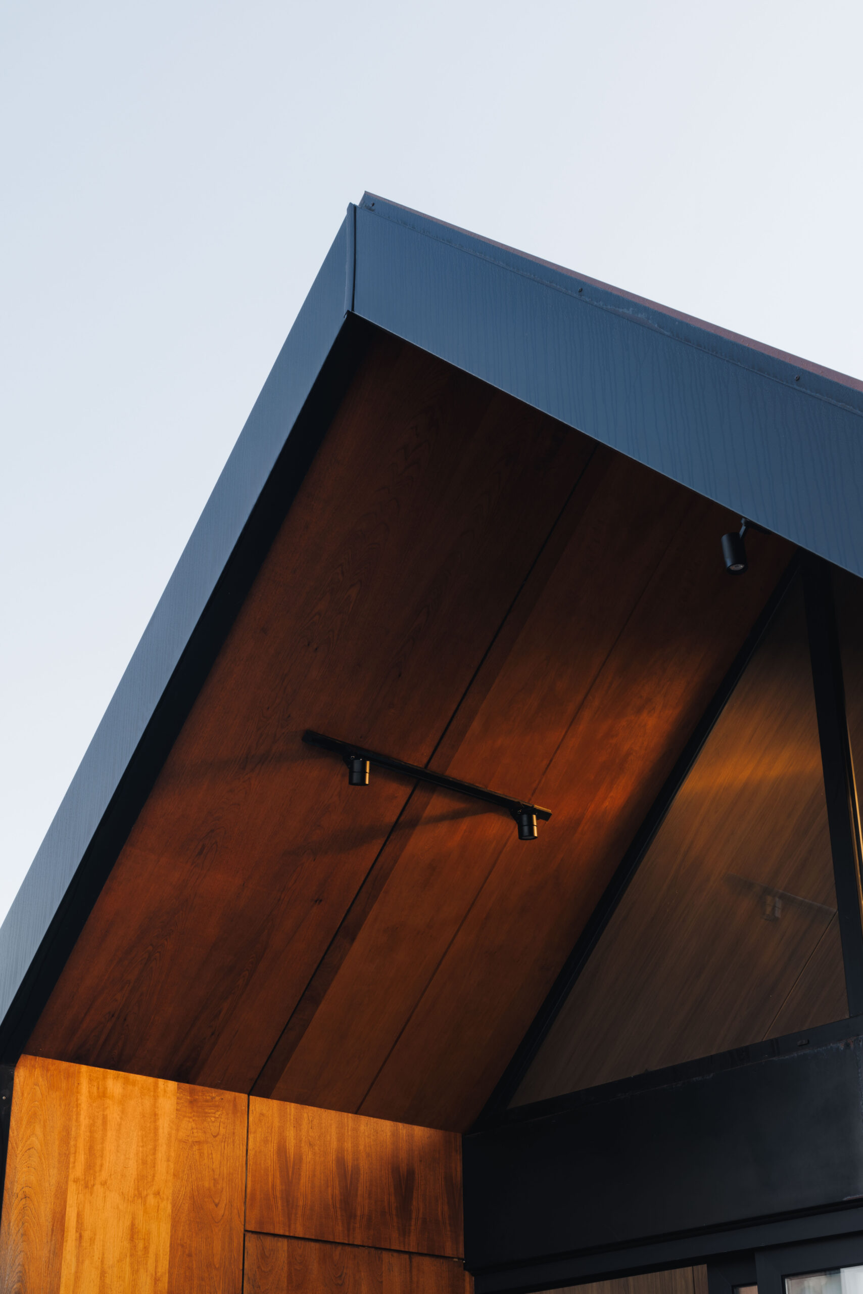 A Casa Felipe é uma residência de 90 m² composta por dois módulos: um com cobertura em duas águas, no estilo chalé, e outro com cobertura plana em sistema flap. O posicionamento em diferentes planos cria um jogo de volumes dinâmico.