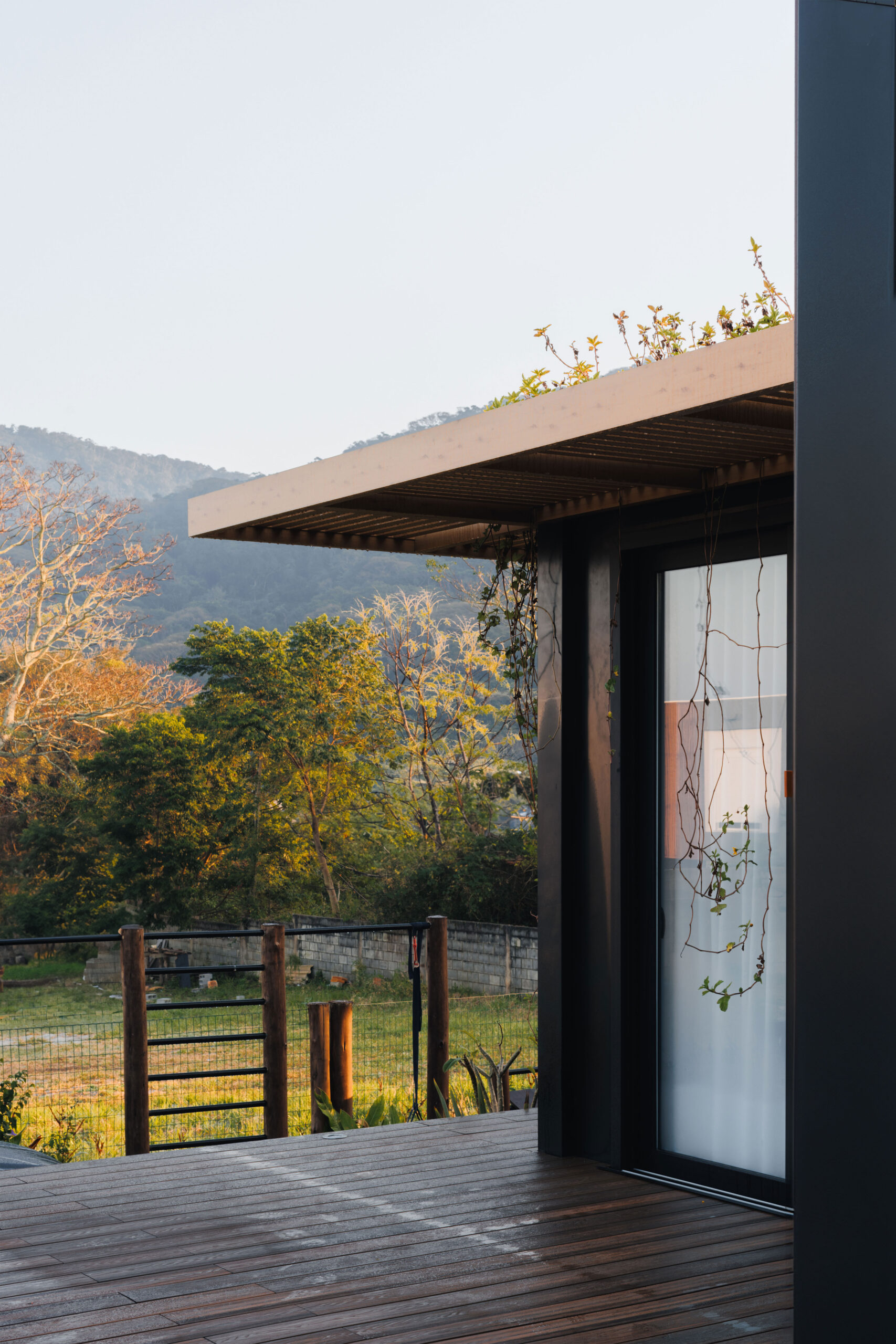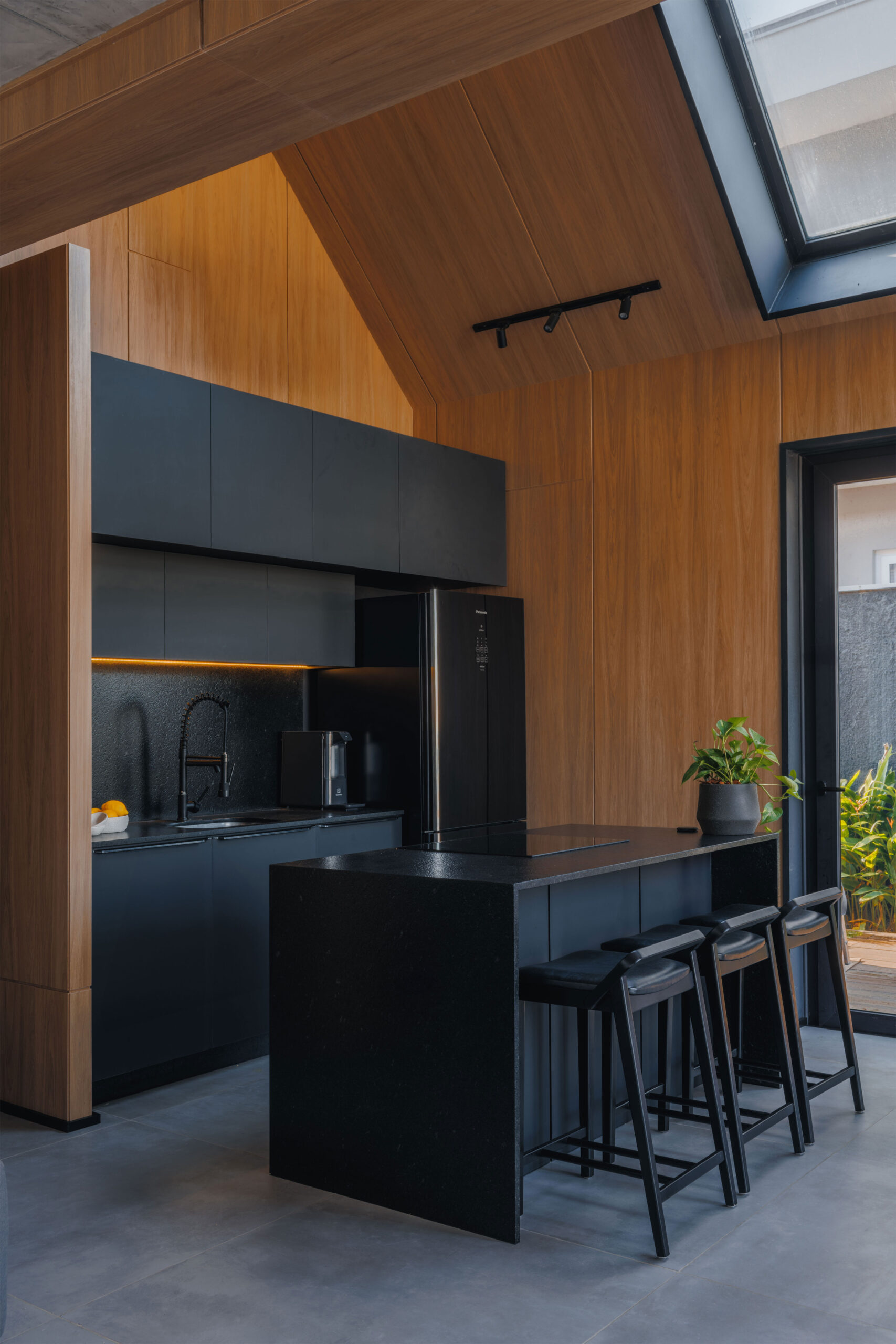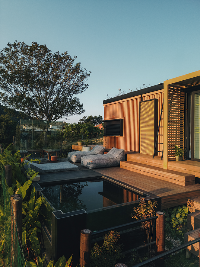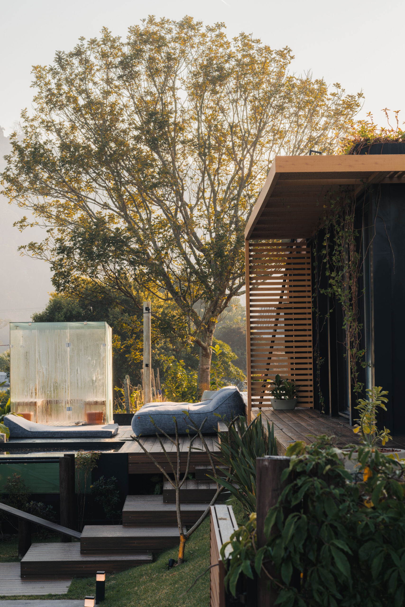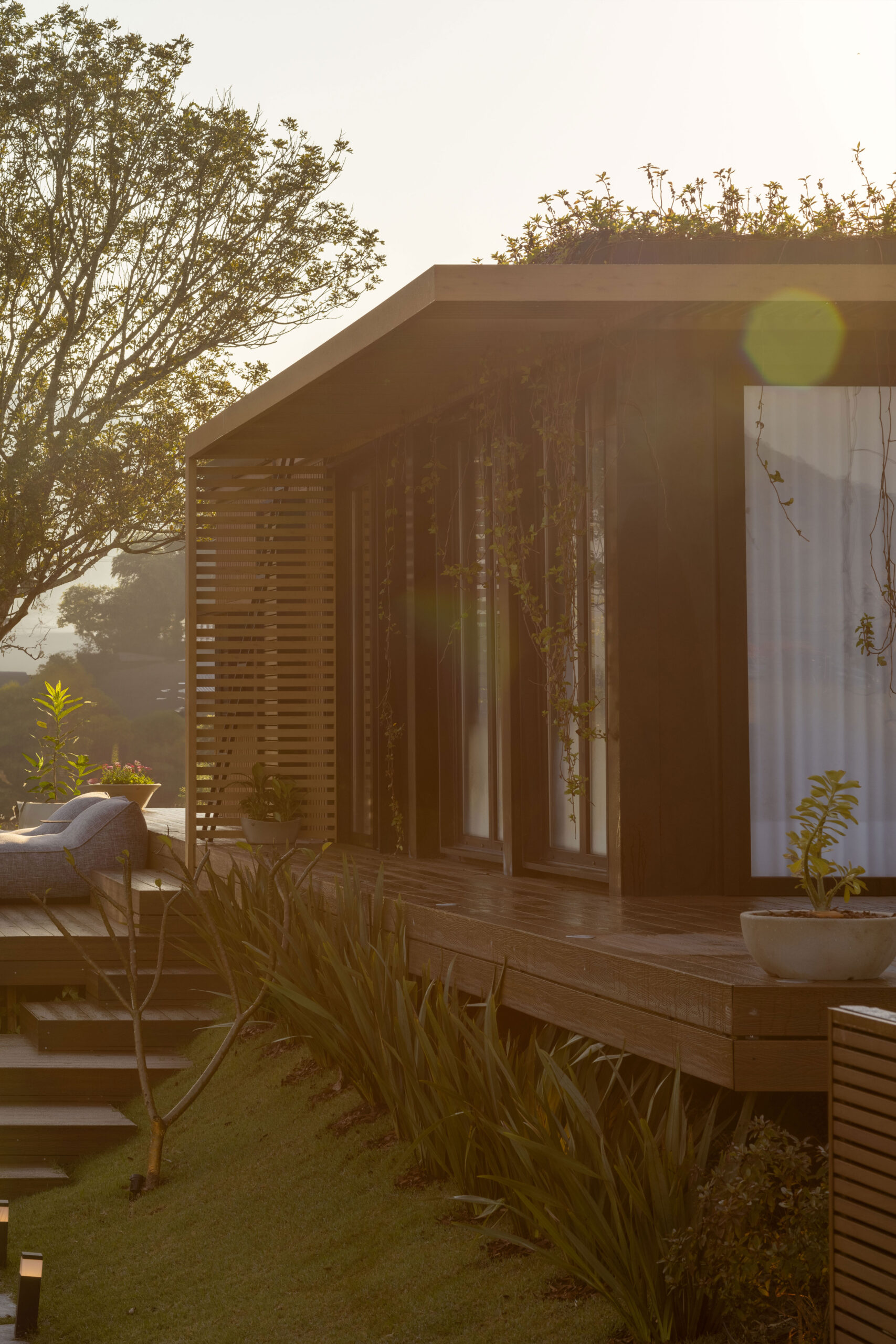 O módulo de cobertura plana abriga um terraço jardim com paisagismo e deck, oferecendo um espaço de contemplação. Internamente, o projeto inclui um living integrado e dois dormitórios, combinando praticidade e conforto em um formato compacto e sofisticado.