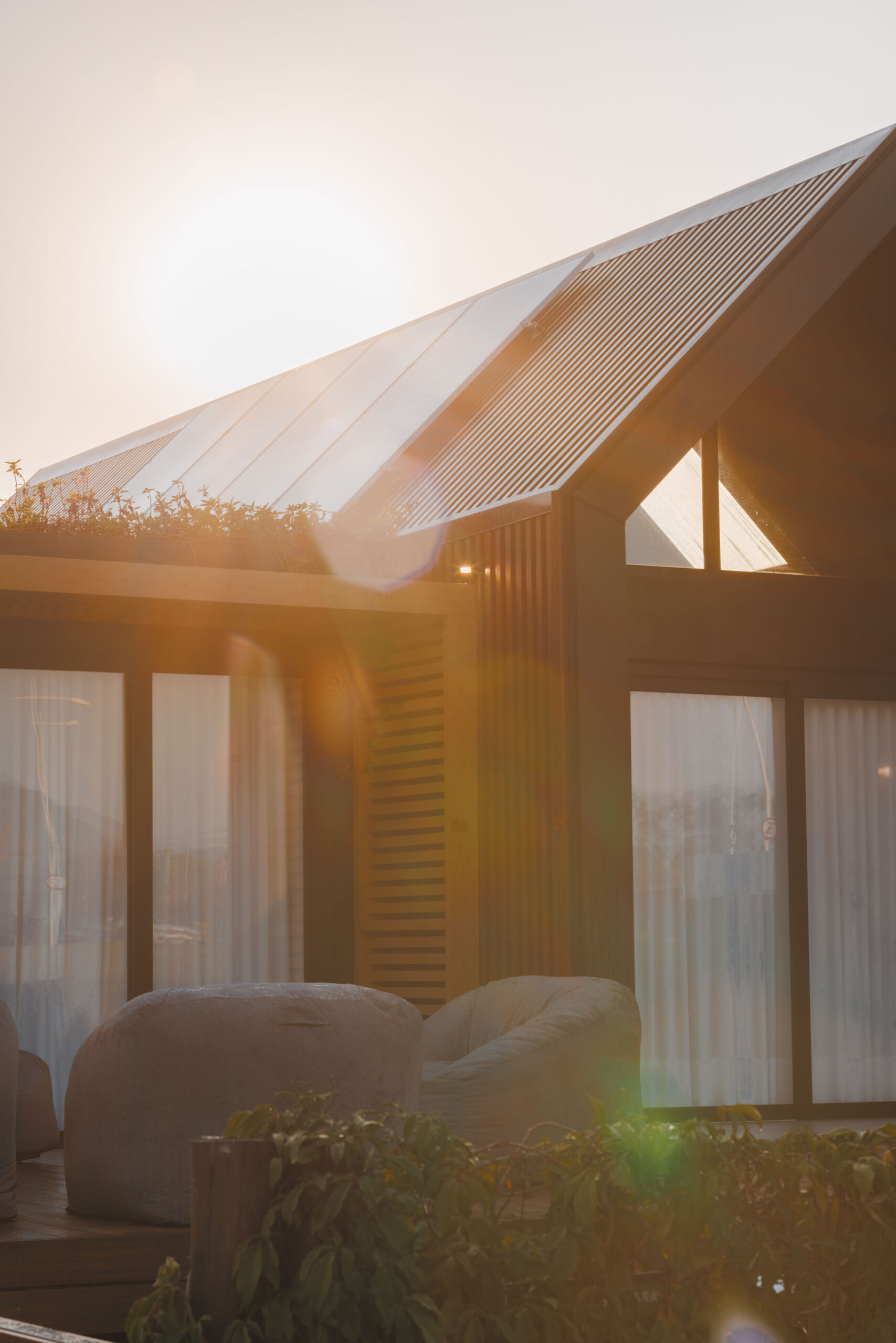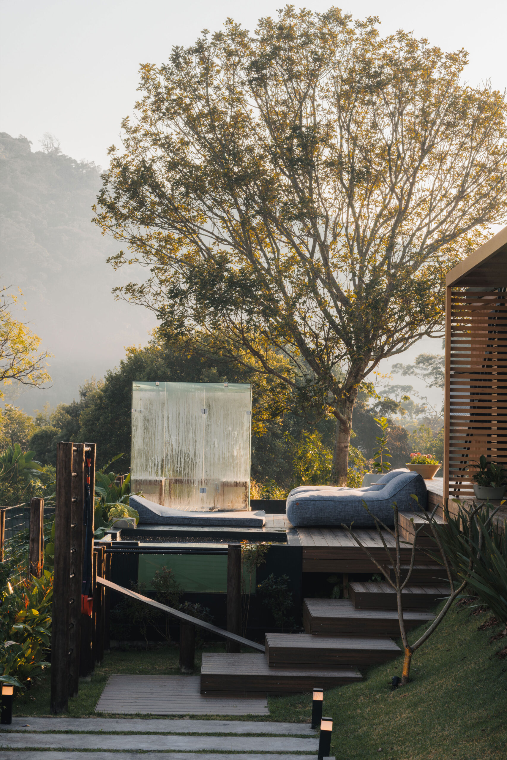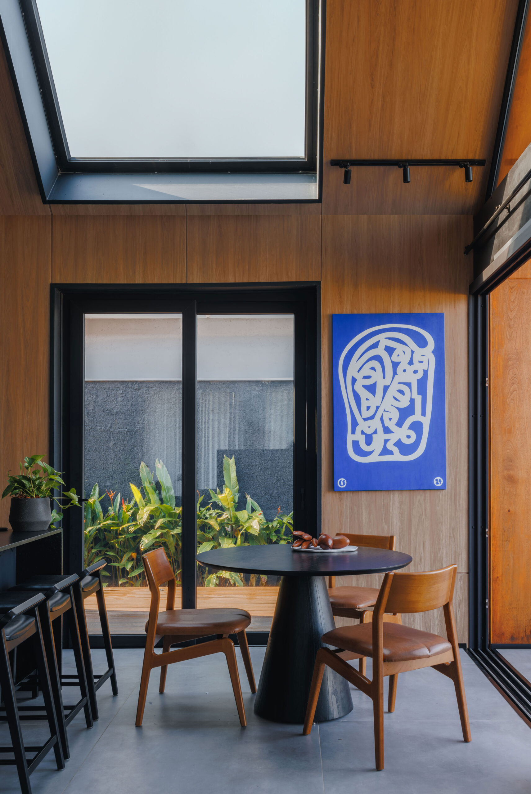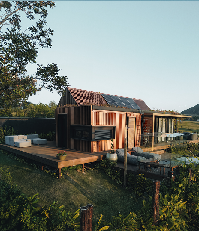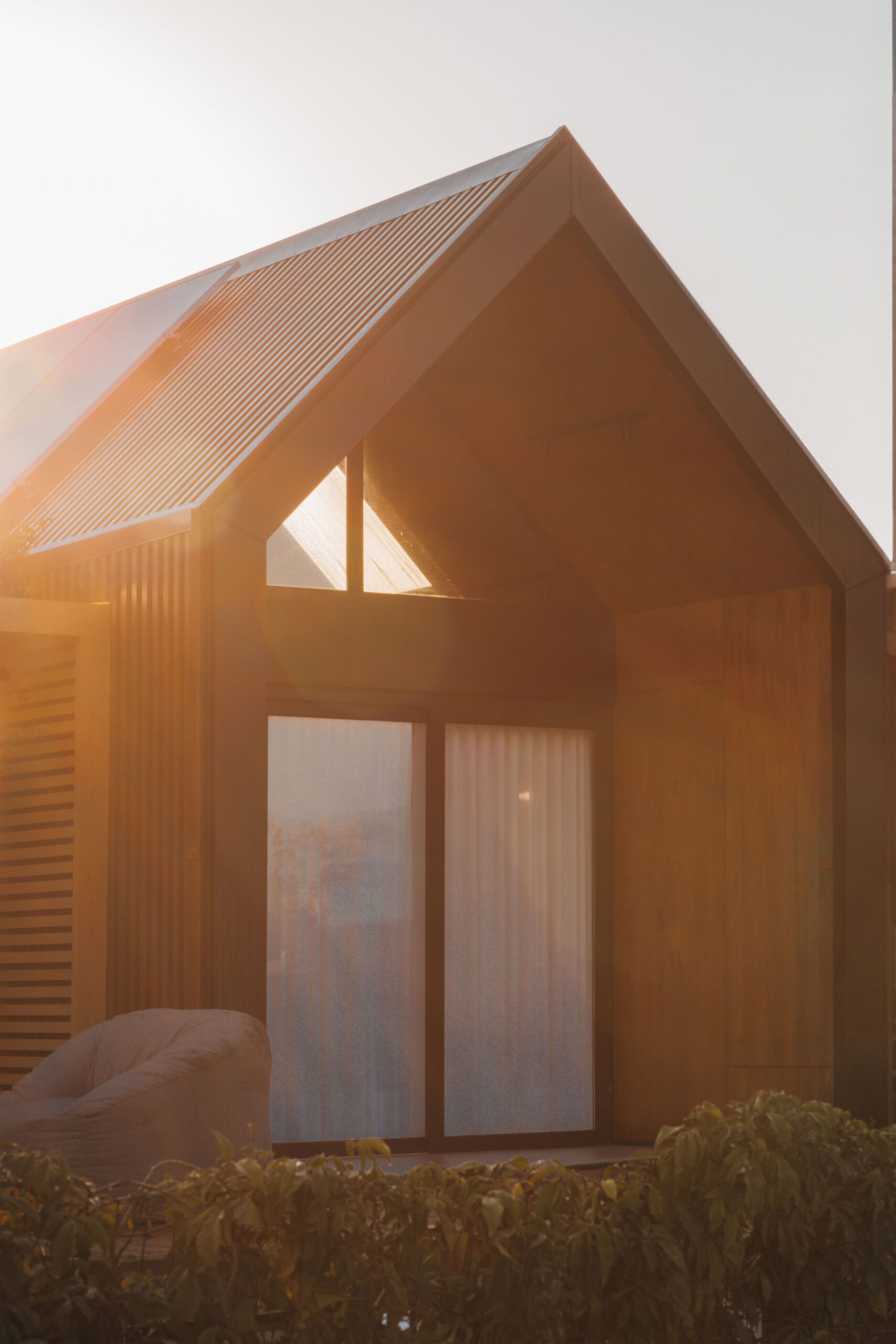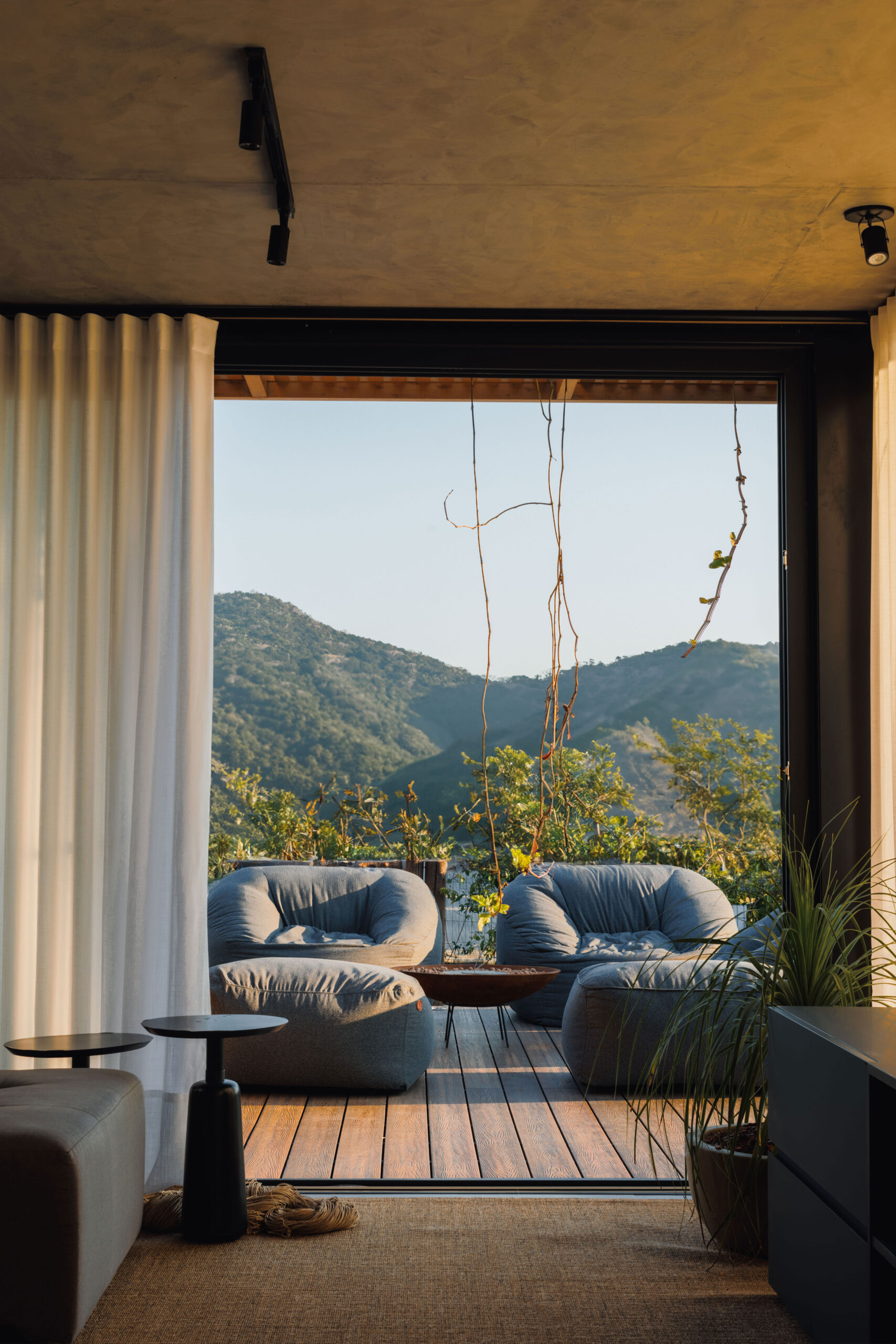 O módulo de cobertura plana abriga um terraço jardim com paisagismo e deck, oferecendo um espaço de contemplação. Internamente, o projeto inclui um living integrado e dois dormitórios, combinando praticidade e conforto em um formato compacto e sofisticado.