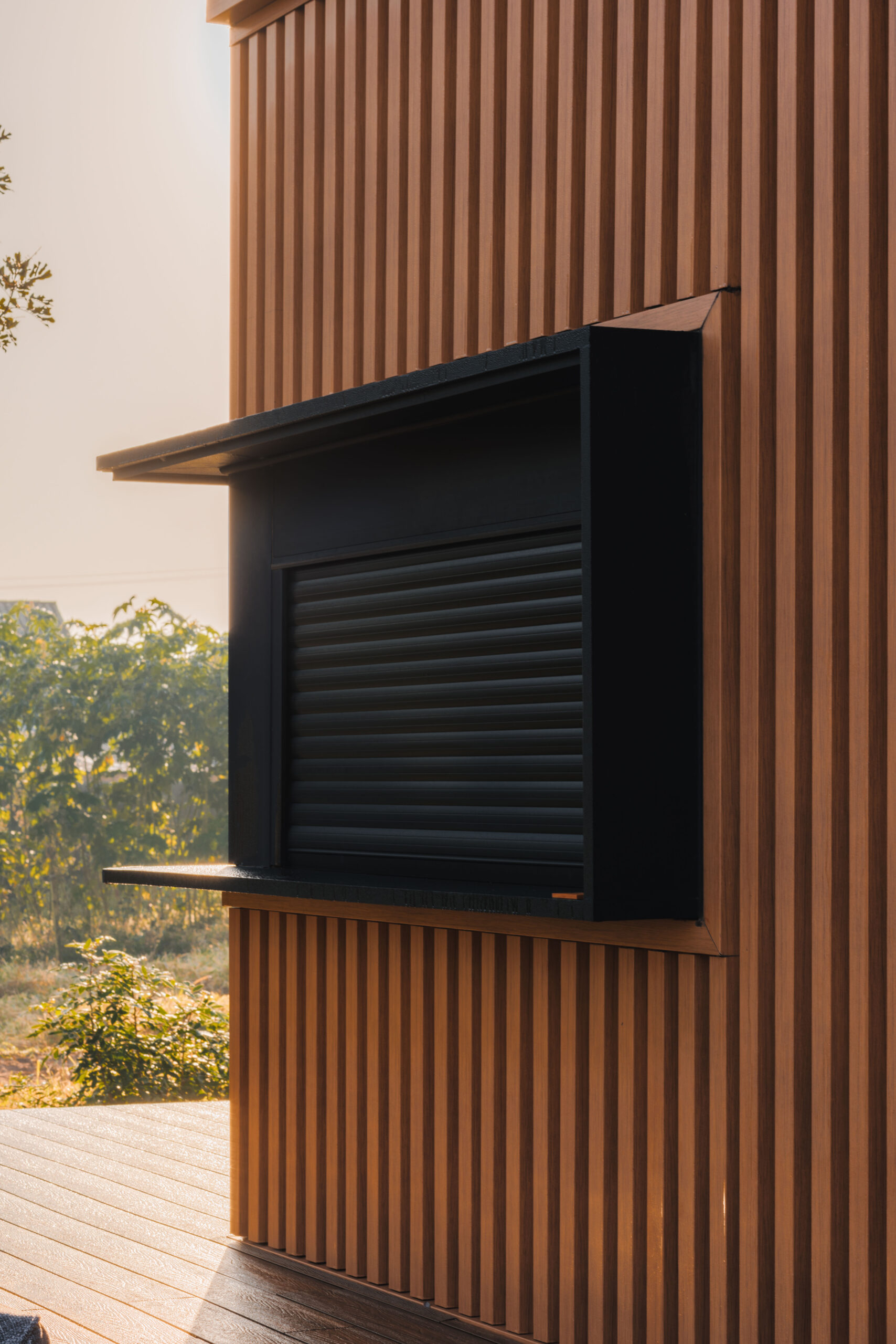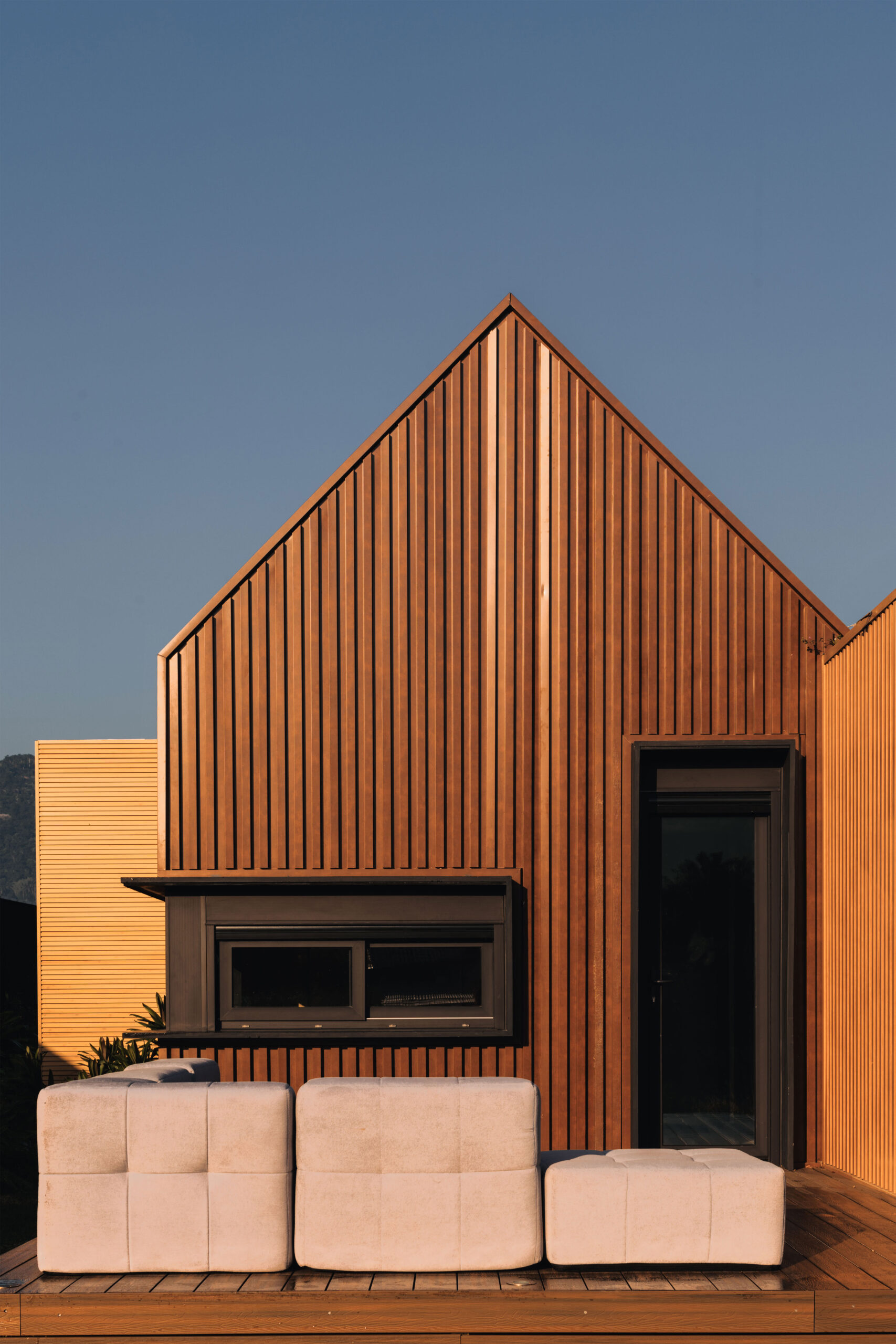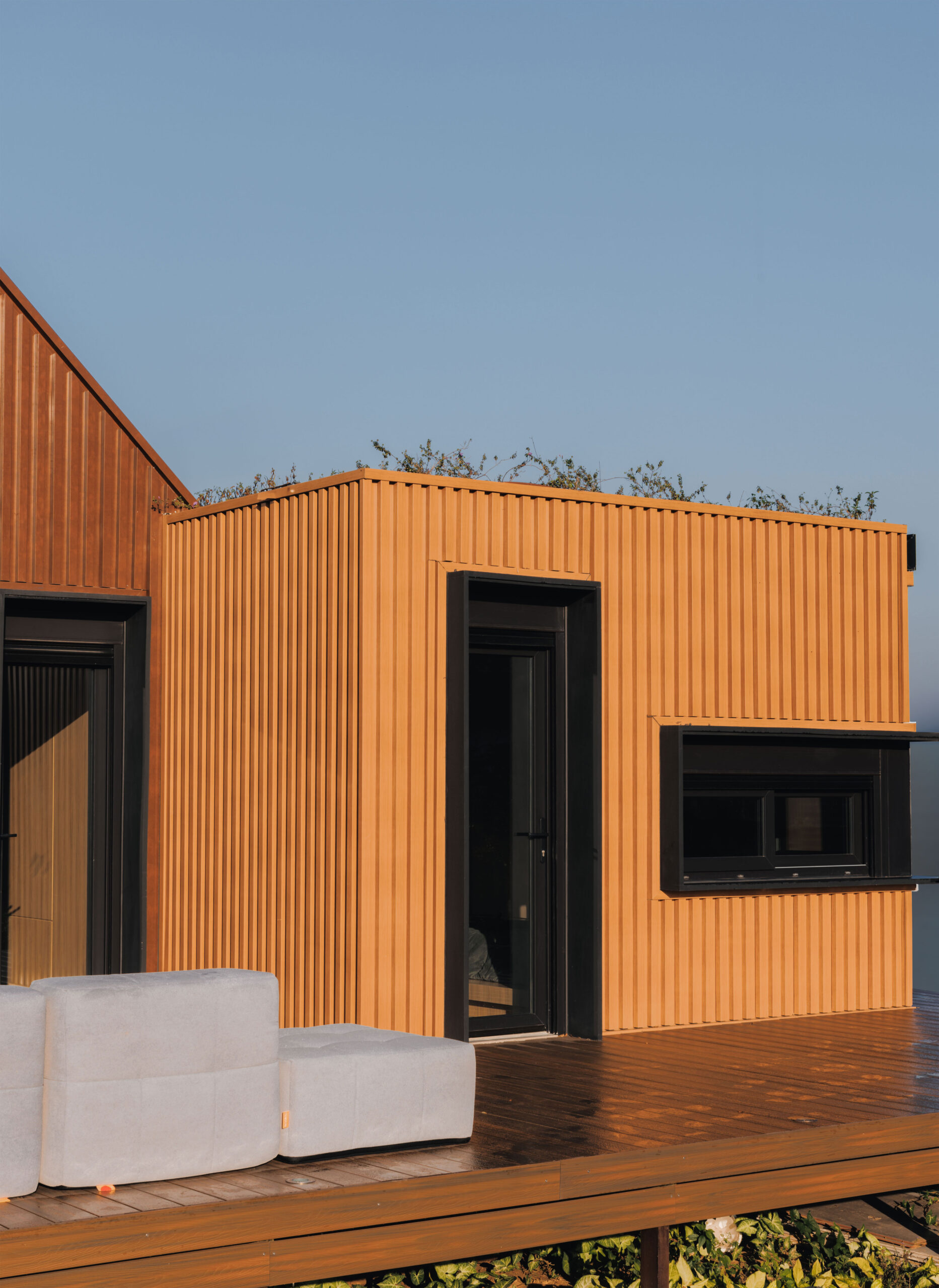 Ambos os módulos são revestidos com painéis metálicos ripados em aço corten e marrom, reforçando a identidade contemporânea. A casa é cercada por um amplo deck em madeira plástica, integrando os ambientes internos ao externo.