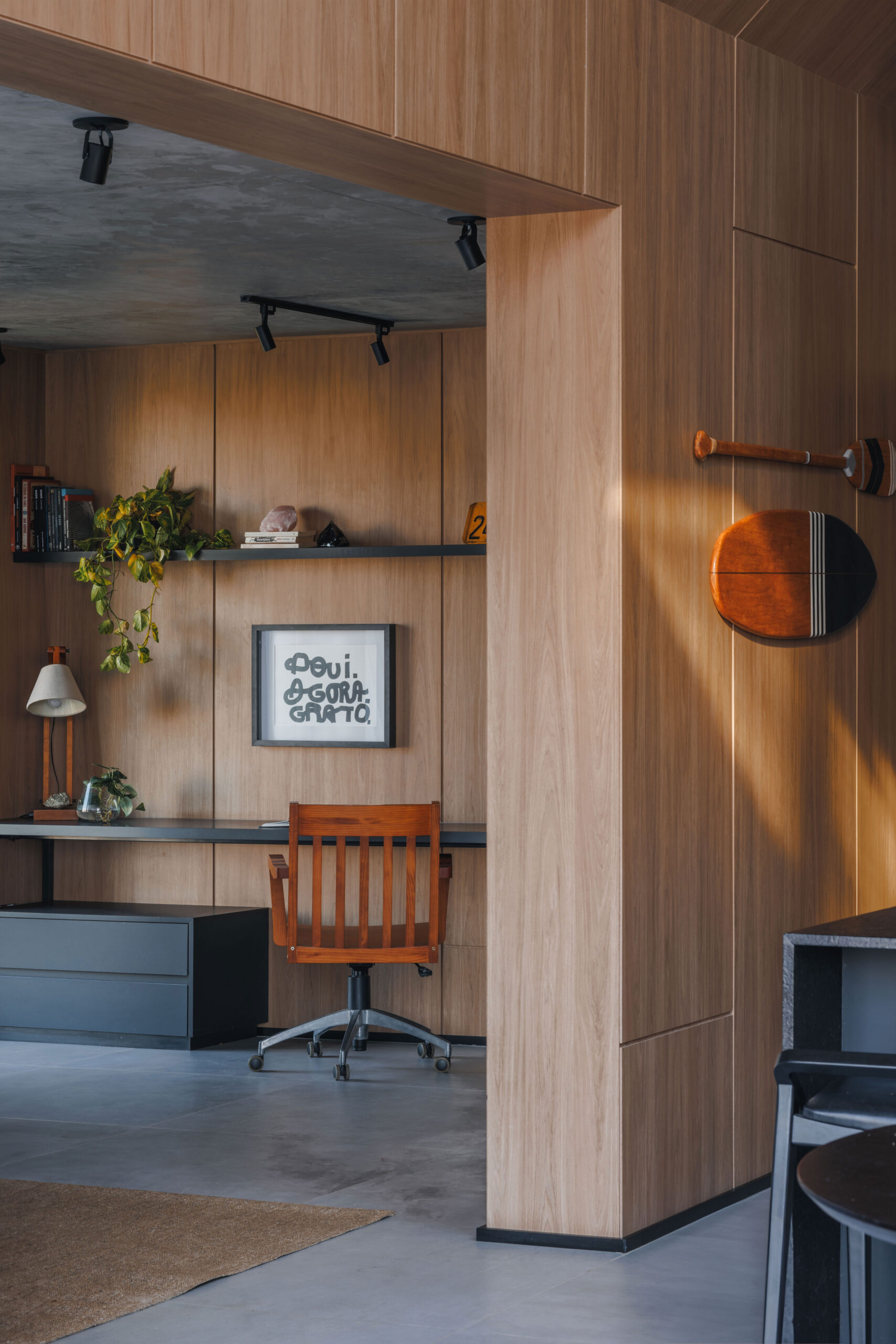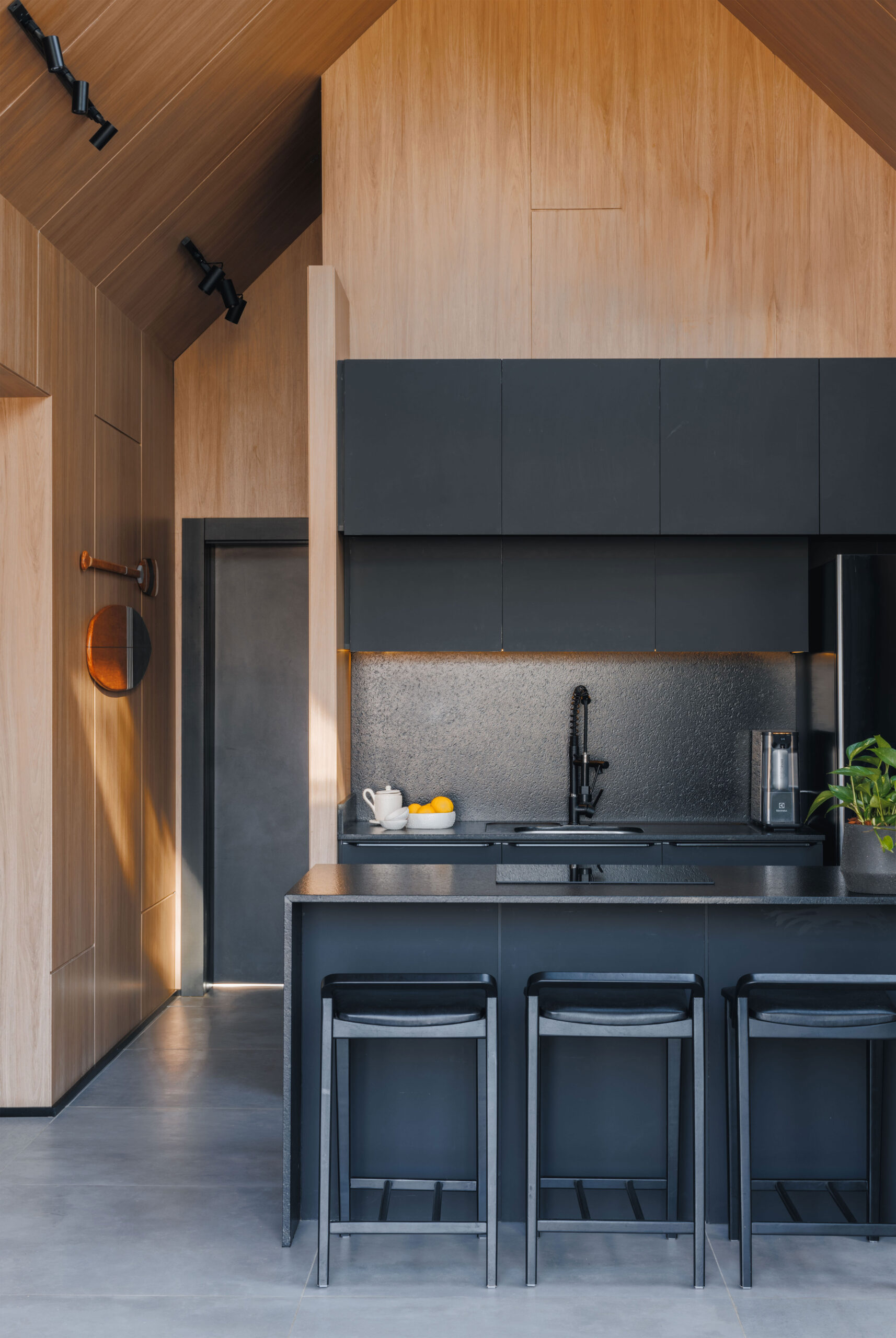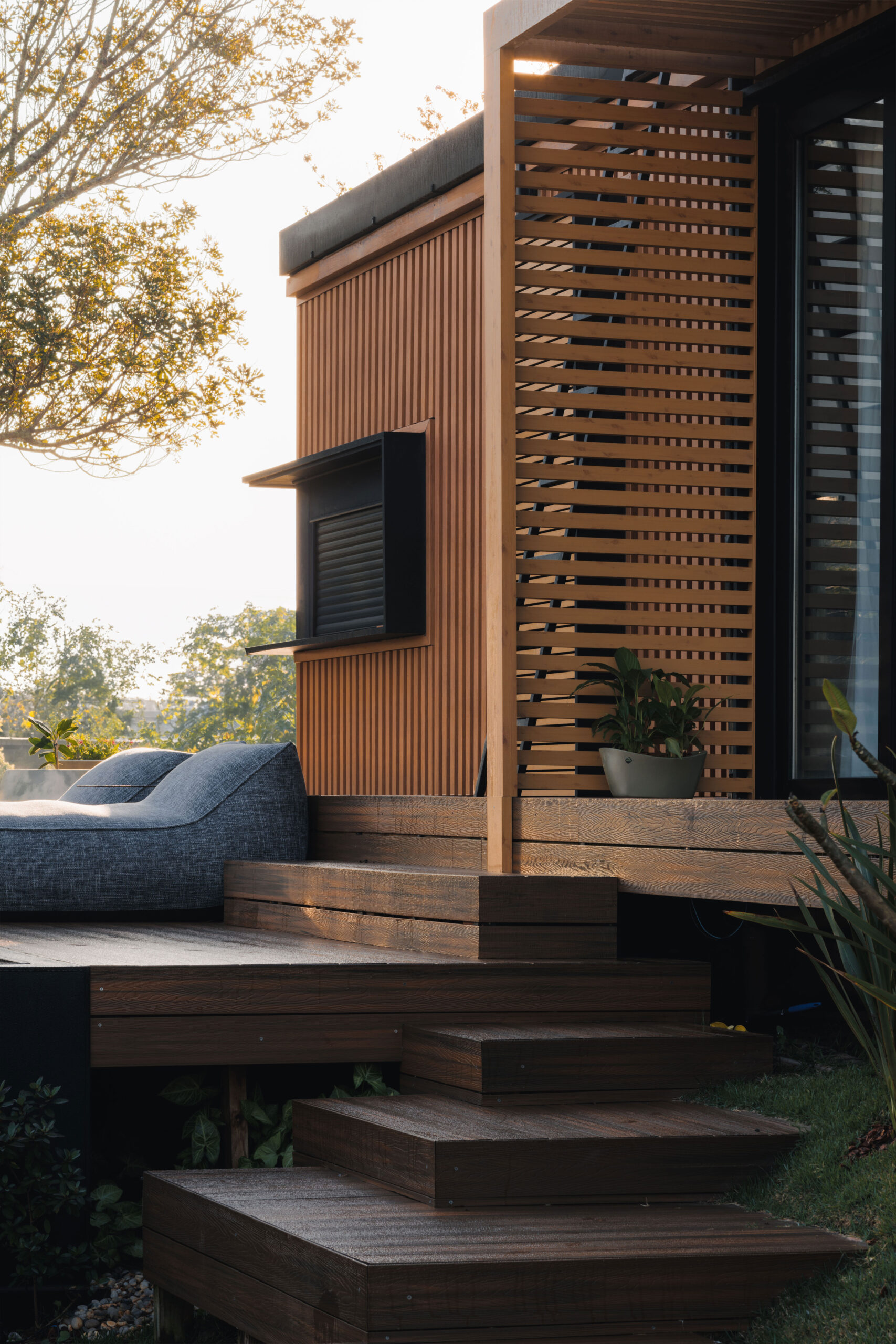 Ambos os módulos são revestidos com painéis metálicos ripados em aço corten e marrom, reforçando a identidade contemporânea. A casa é cercada por um amplo deck em madeira plástica, integrando os ambientes internos ao externo.