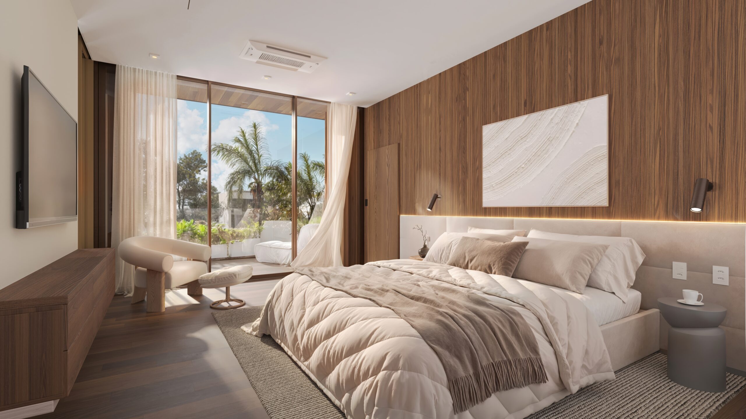 No pavimento superior (65,31 m²), a suíte master oferece closet, varanda e terraço privativo, garantindo privacidade e exclusividade, mantendo a conexão visual com o exterior.
