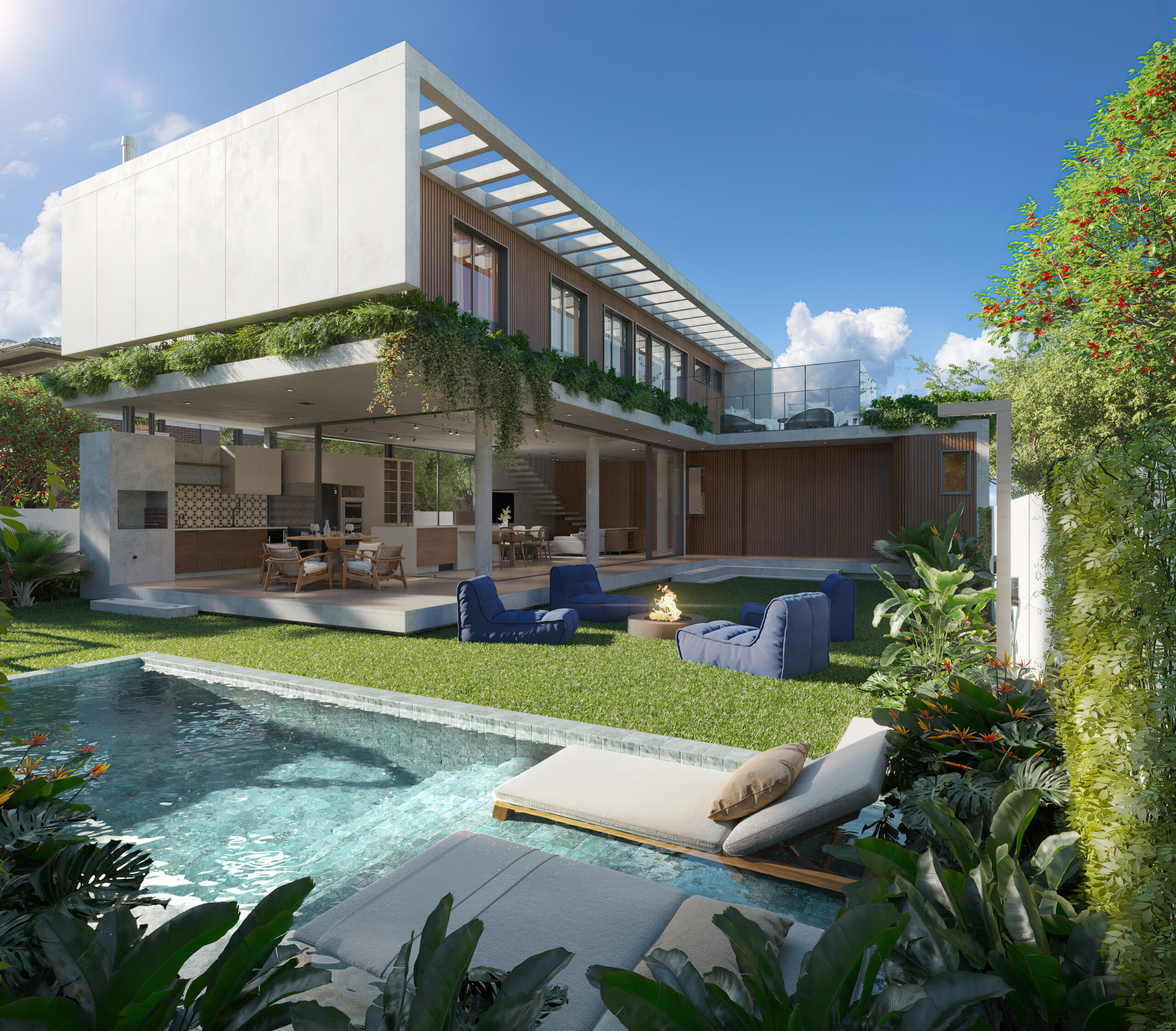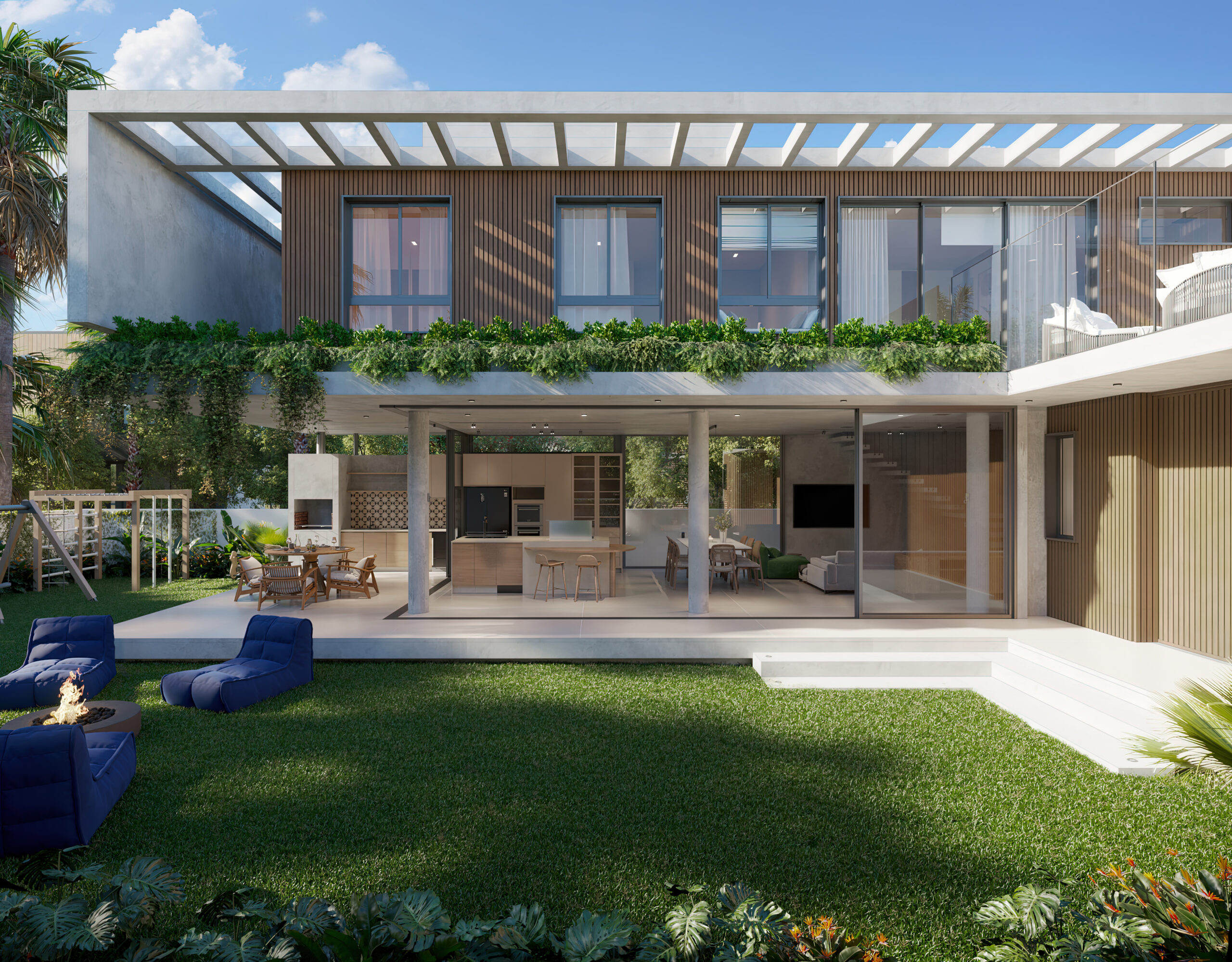 Com 280 m² em dois pavimentos, a residência tem planta em “L” que envolve um pátio central, integrando piscina e área verde aos ambientes internos.