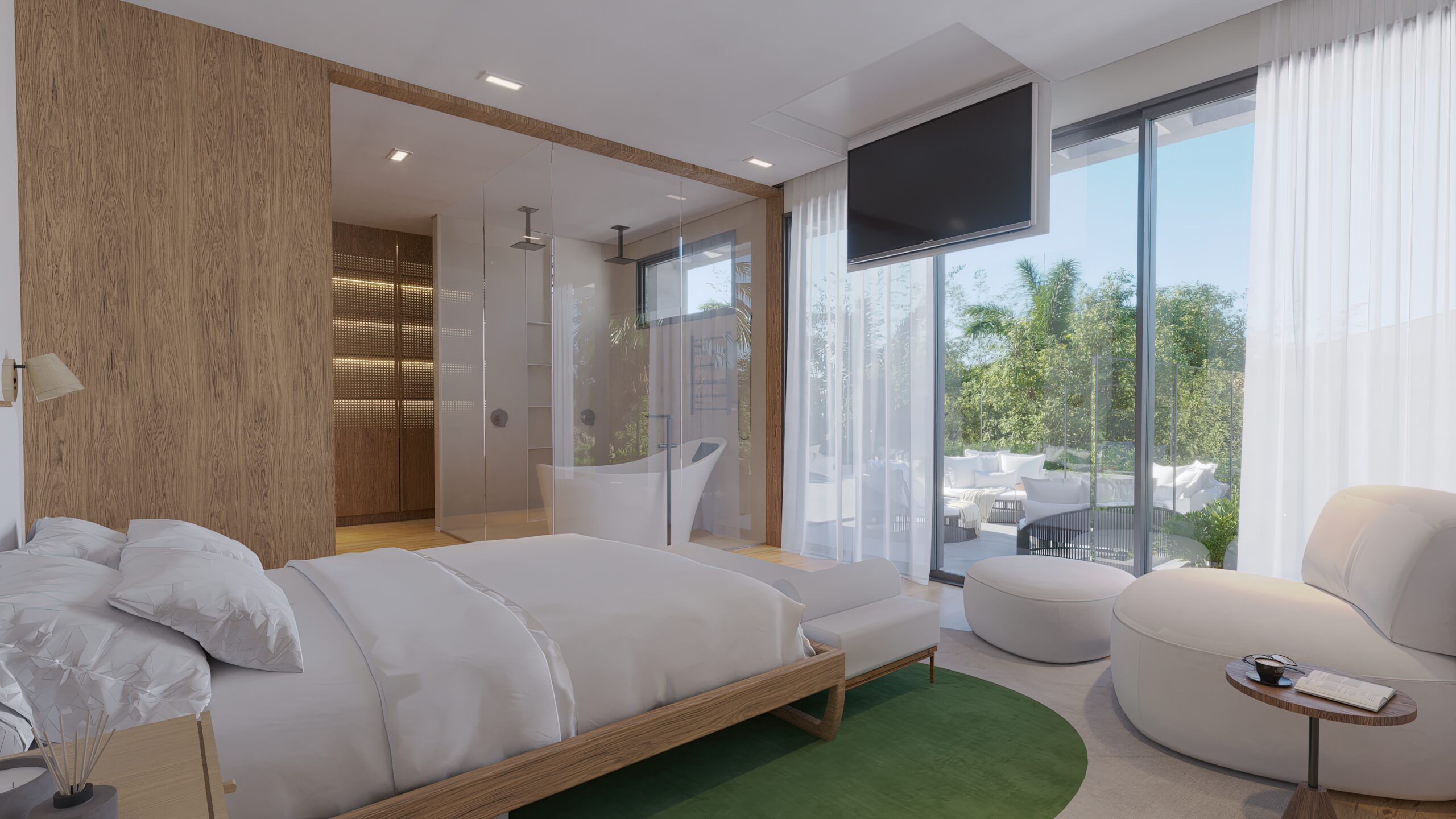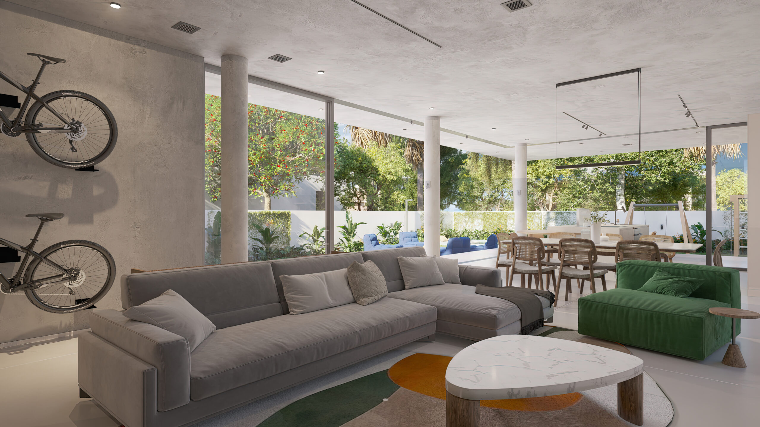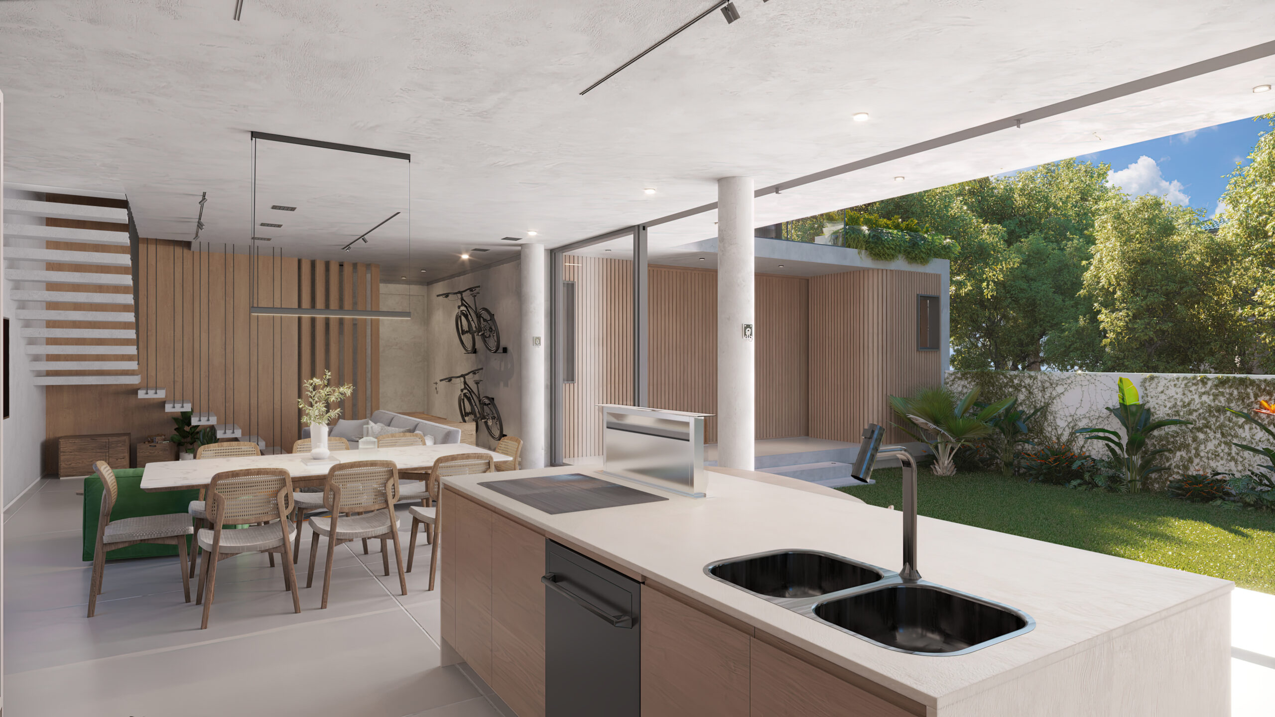 O pavimento térreo abriga os espaços sociais, como living integrado à área gourmet e escritório, além de áreas funcionais como garagem, lavanderia e depósito. O pavimento superior é dedicado à área íntima, com suíte master, terraço, dois dormitórios e um escritório, garantindo conforto e privacidade.